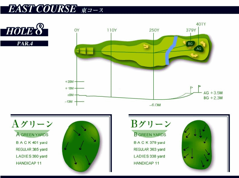 ほぼストレートなパー4。ティーショットが左バンカーより左に行った場合はほぼOBとなる。ティーショットは安全を考えてフェアウェイのやや右目狙いがベスト。